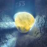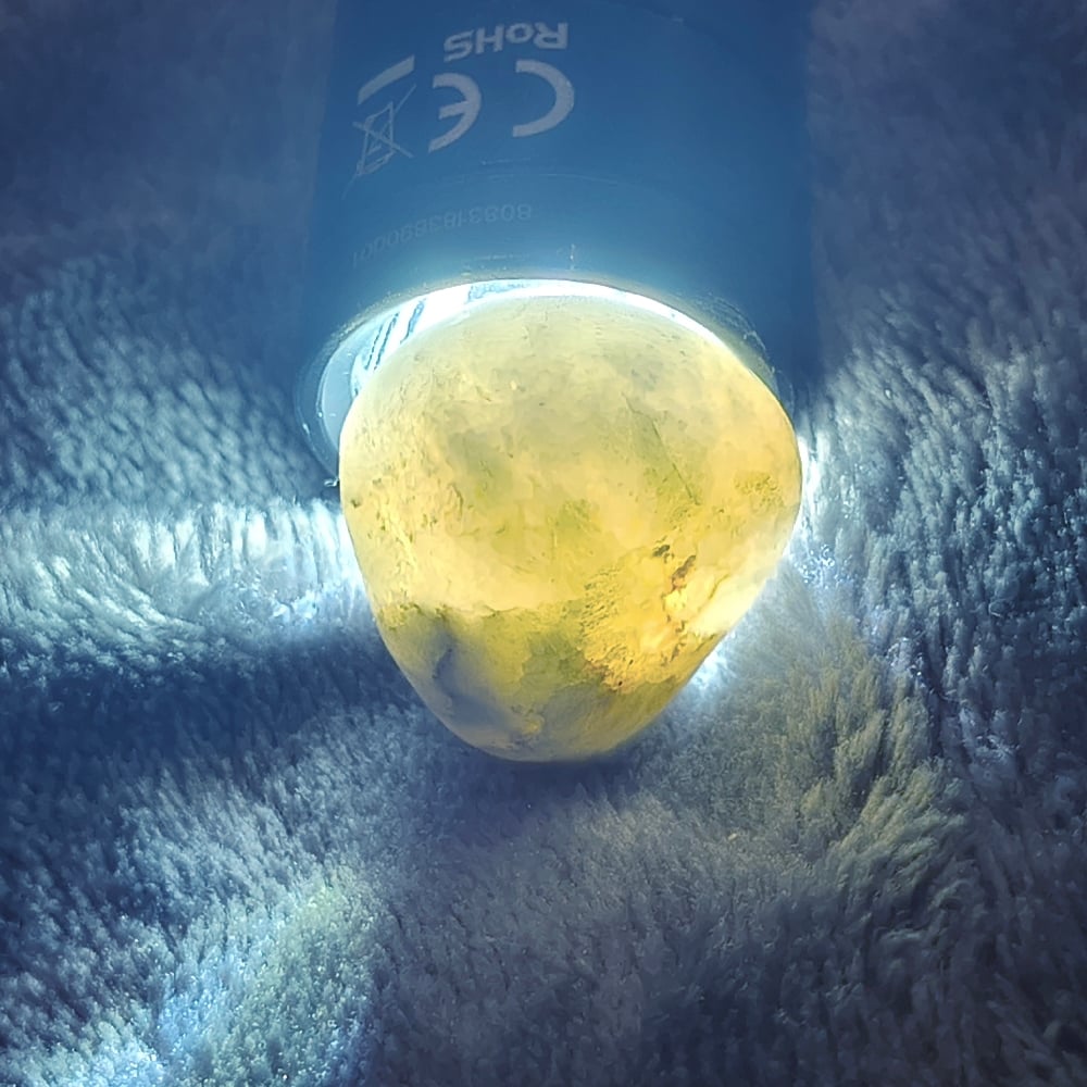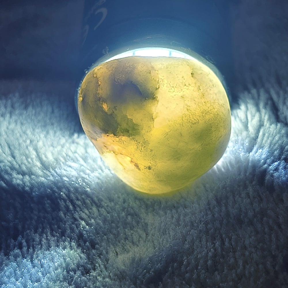 Γαλακτώδες, ημιδιαπερατό στο φως, με εσωτερικές λαδί–κιτρινωπές ζώνες από φυσικά σιδηρούχα εγκλείσματα. Σε συγκεκριμένη γωνία φωτισμού εμφανίζονται ήπιες ασημόλευκες αντανακλάσεις λόγω της μικροκρυσταλλικής δομής του χαλαζία.