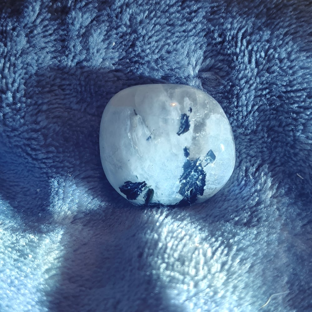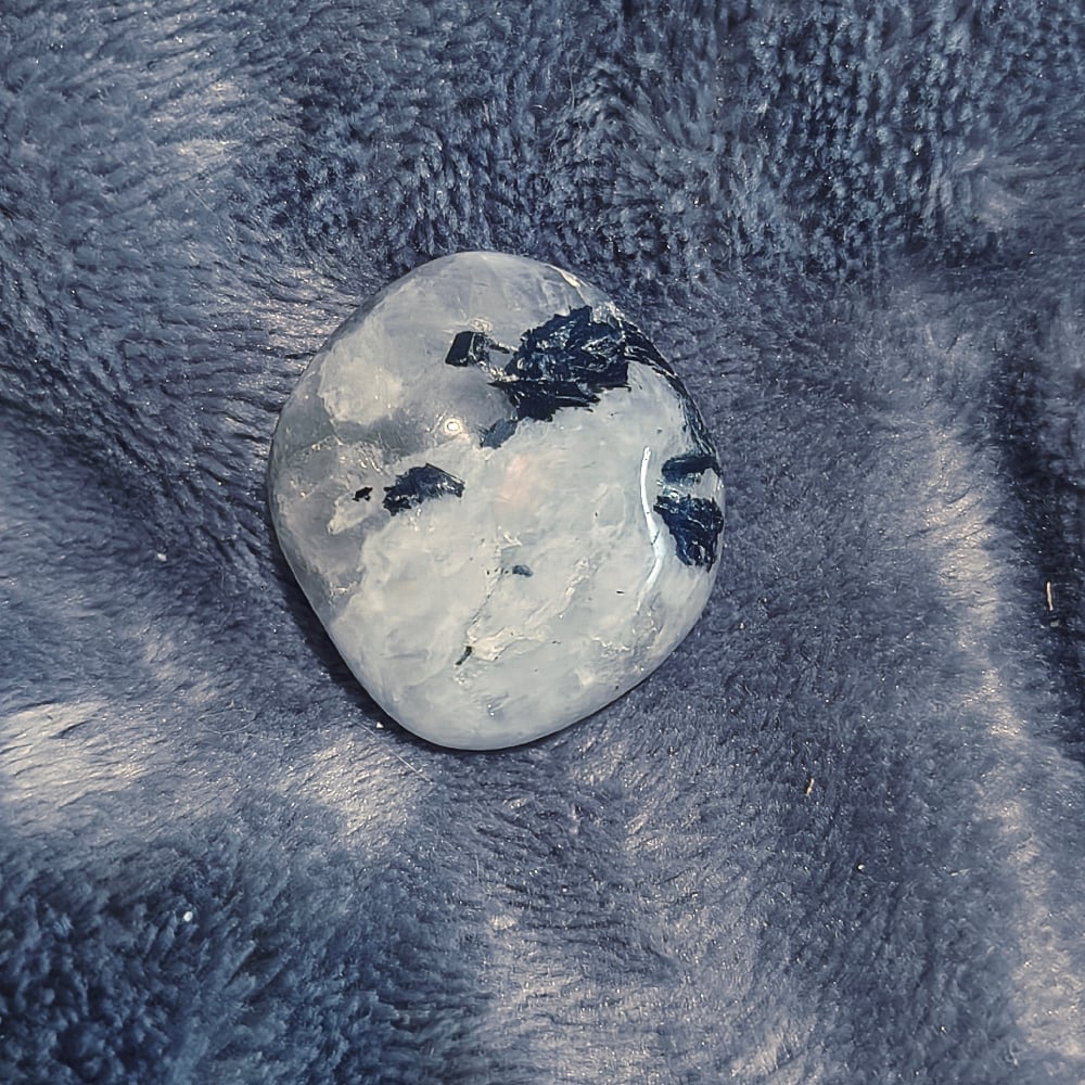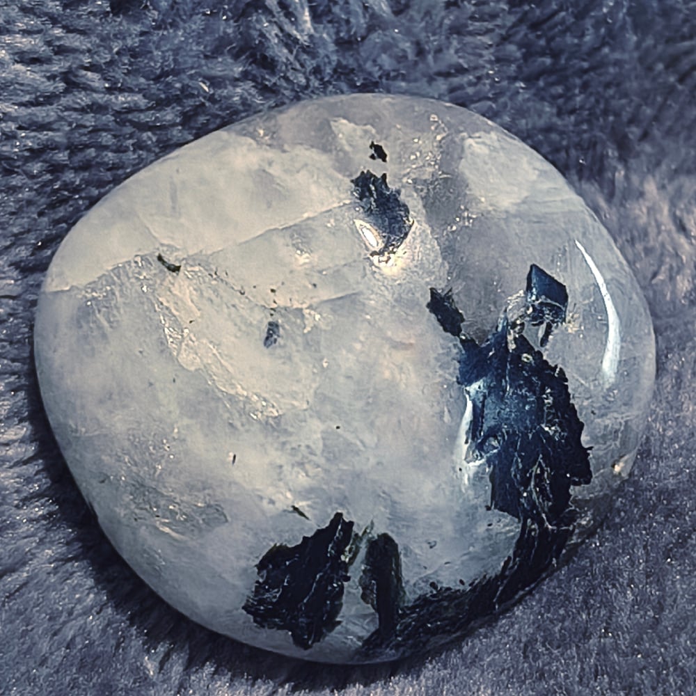 Φεγγαρόπετρα με έντονα μαύρα εγκλείσματα (πιθανός τουρμαλίνης / βιοτίτης), που δημιουργούν έντονη αντίθεση και βάθος στο φως.