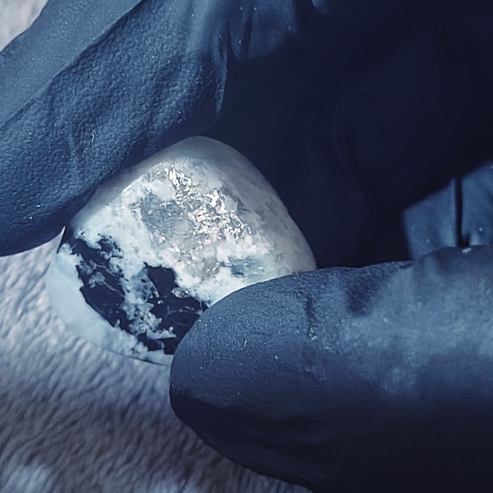 Φεγγαρόπετρα με έντονα μαύρα εγκλείσματα (πιθανός τουρμαλίνης / βιοτίτης), που δημιουργούν έντονη αντίθεση και βάθος στο φως.